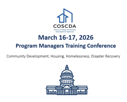The COSCDA Community Development, Housing, Homelessness, and Disaster Recovery Program Managers Training Conferences are held annually in March in Washington, D.C. The “four” Conferences are designed to benefit state agency administrative staff working in COSCDA’s primary program areas. The “four” Conferences under one umbrella are offered concurrently to facilitate the provision of joint workshops on topics of common interest.